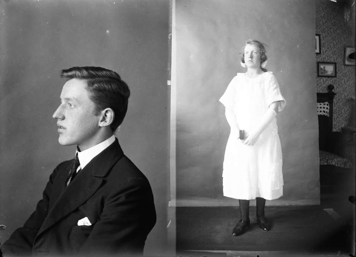 Porträtt, man och flicka (konfirmand?). Två bilder.