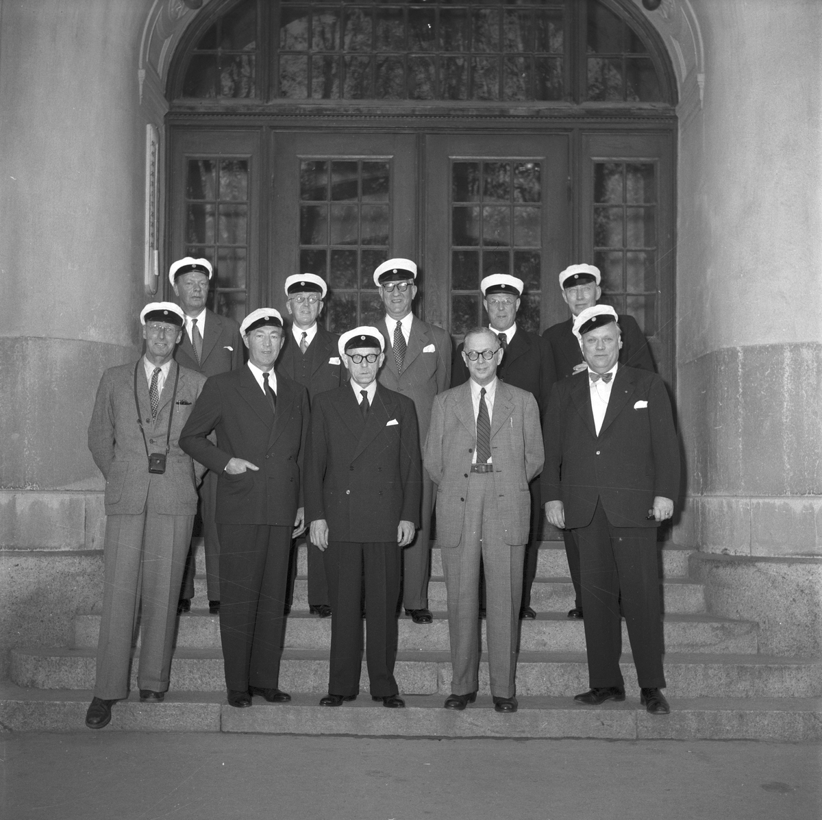 Studentjubileum. Grupp tagen på Högre Allmänna Läroverkets trappa. 30 maj 1954.