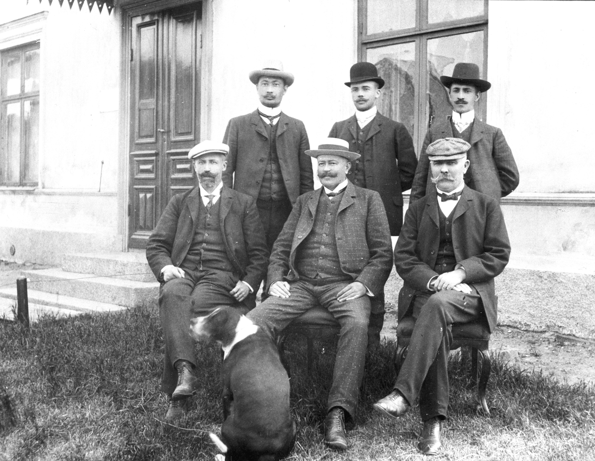Män framför en byggnad. Den 20 november 1954. Kopia
