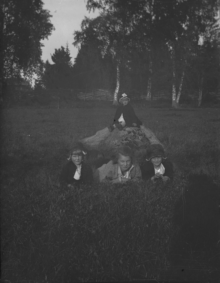 Karin och Ingrid Brundin tillsammans med kusinen Lisa Hedman i mitten. På stenen sitter Eva Brundin.