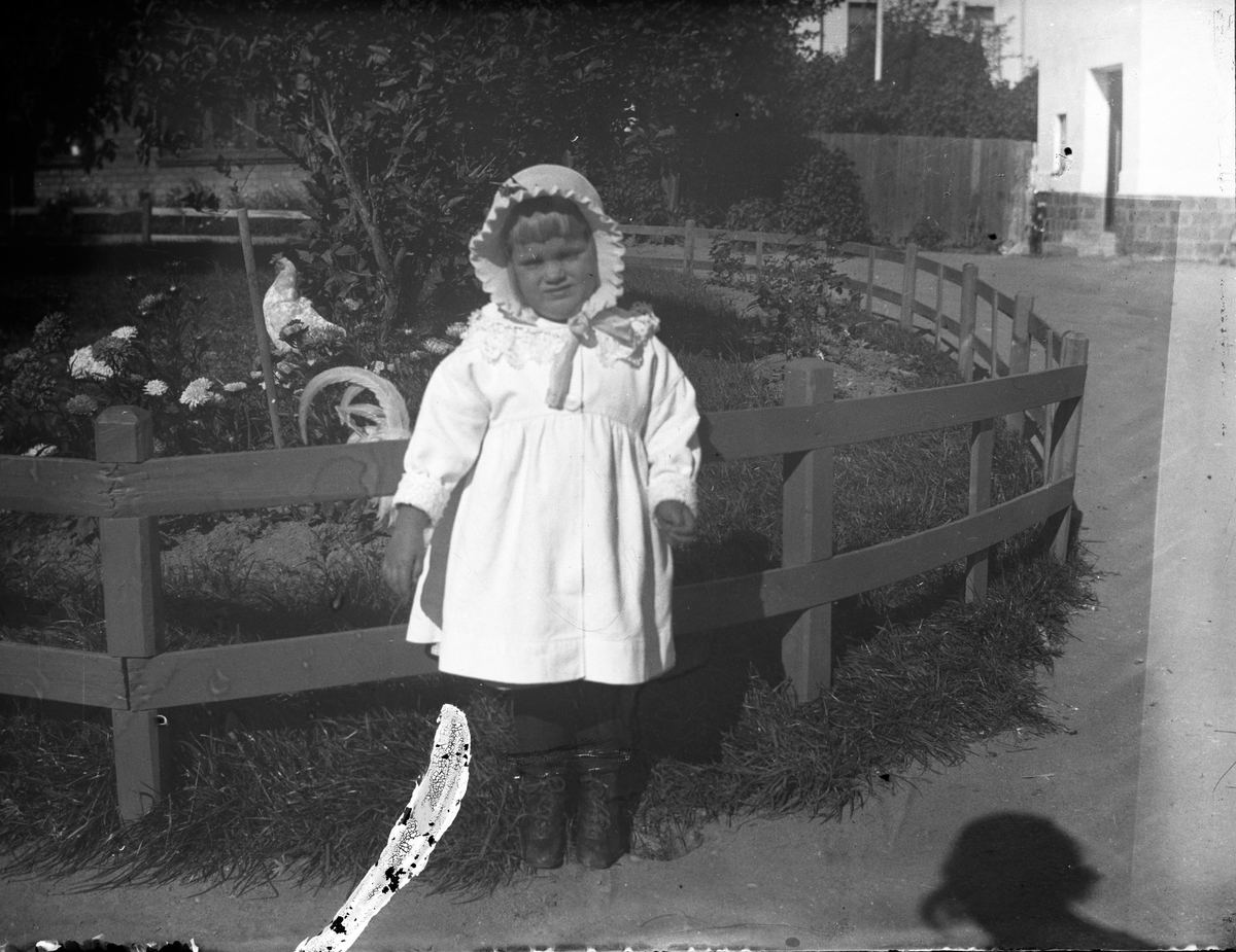 Eva Brundin på gården till Södra Centralgatan 26. Ägaren av fastigheten var en herr Lysén som hade en sågfabrik. I mitten av rondellen stod en hängalm. Här fanns tydligen också höns.