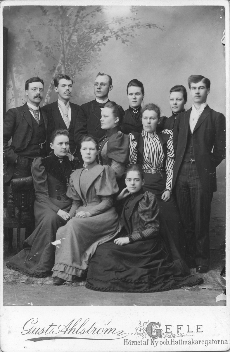 Ungdomar i Matheuskyrkan i Gävle år 1890. Personerna: Emma Eklöf, Jenny Andersson, Freja Höjer, Ingegerd Höjer-Eklöf, Märtha Ahlström-Cederholm, Kerstin Andersson-Eklöf, Ester Eklöf-Höjer, Ernst Eklöf, Erik Eklöf, Ale Höjer, Leonard Strömberg och Axel Bylund.