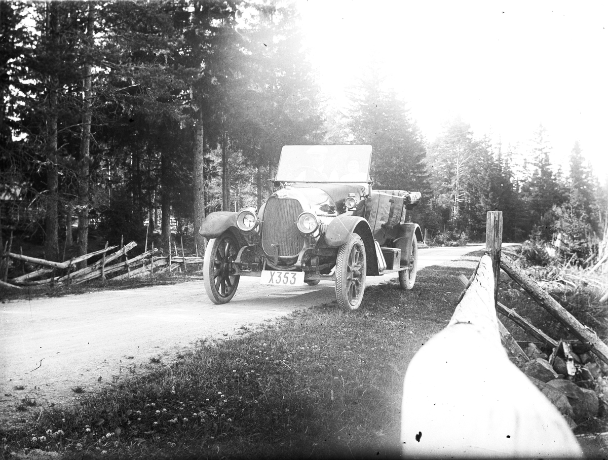 Bilen Selve 1920-1921, ägare Brundin, på utflykt. Elna Brundin har gått ur bilen för att fotografera fordonet. David Brundin syns knappt bakom vindrutan. Observera veven framtill på bilen, man var tvungen att veva igång bilen.