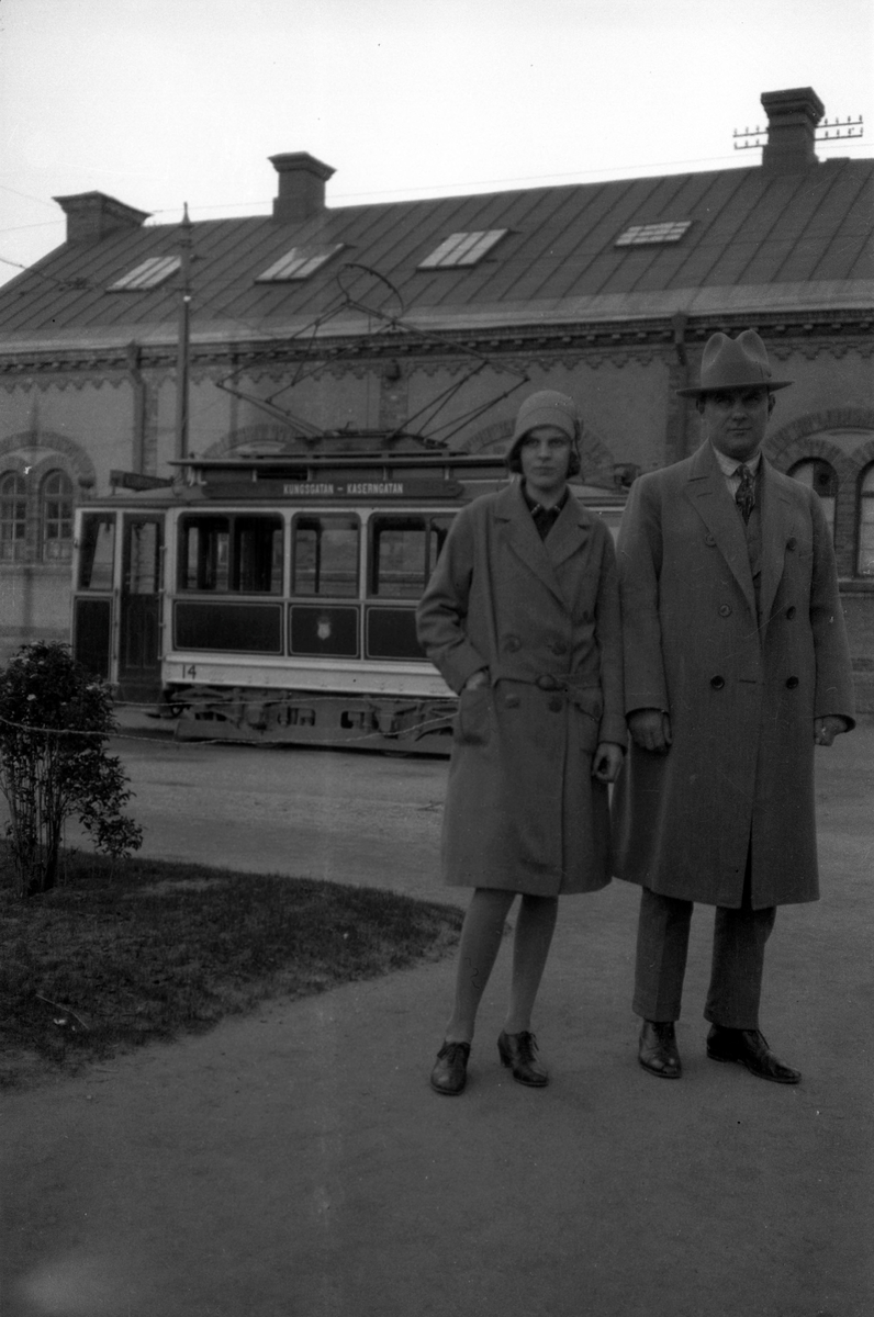 David Brundin som nybliven änkeman med dottern Ingrid, som var 17-18 år när Elna dog. Hon övertog, efter normalskolekompetensen i Själanderska skolan, en hel del av ansvaret för familjens skötsel och omvårdnad. Bilden är från hörnet av Kaserngatan och Centralgatan. Där var ändhållplats för dom röda spårvagnarna i Gävle.