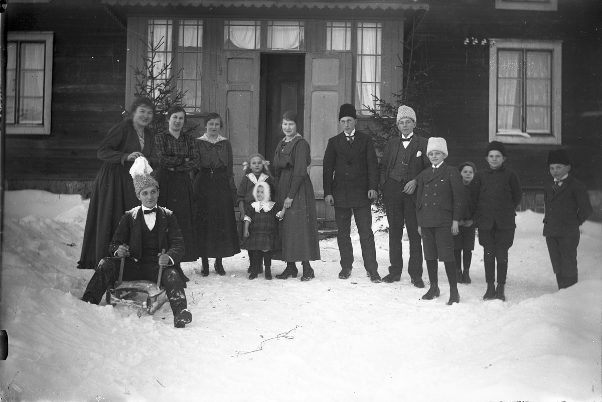 Familjeporträtt utanför bostadshuset vintertid. Vilhelm Anderssons gård i Stenshyttan, Torsåker.