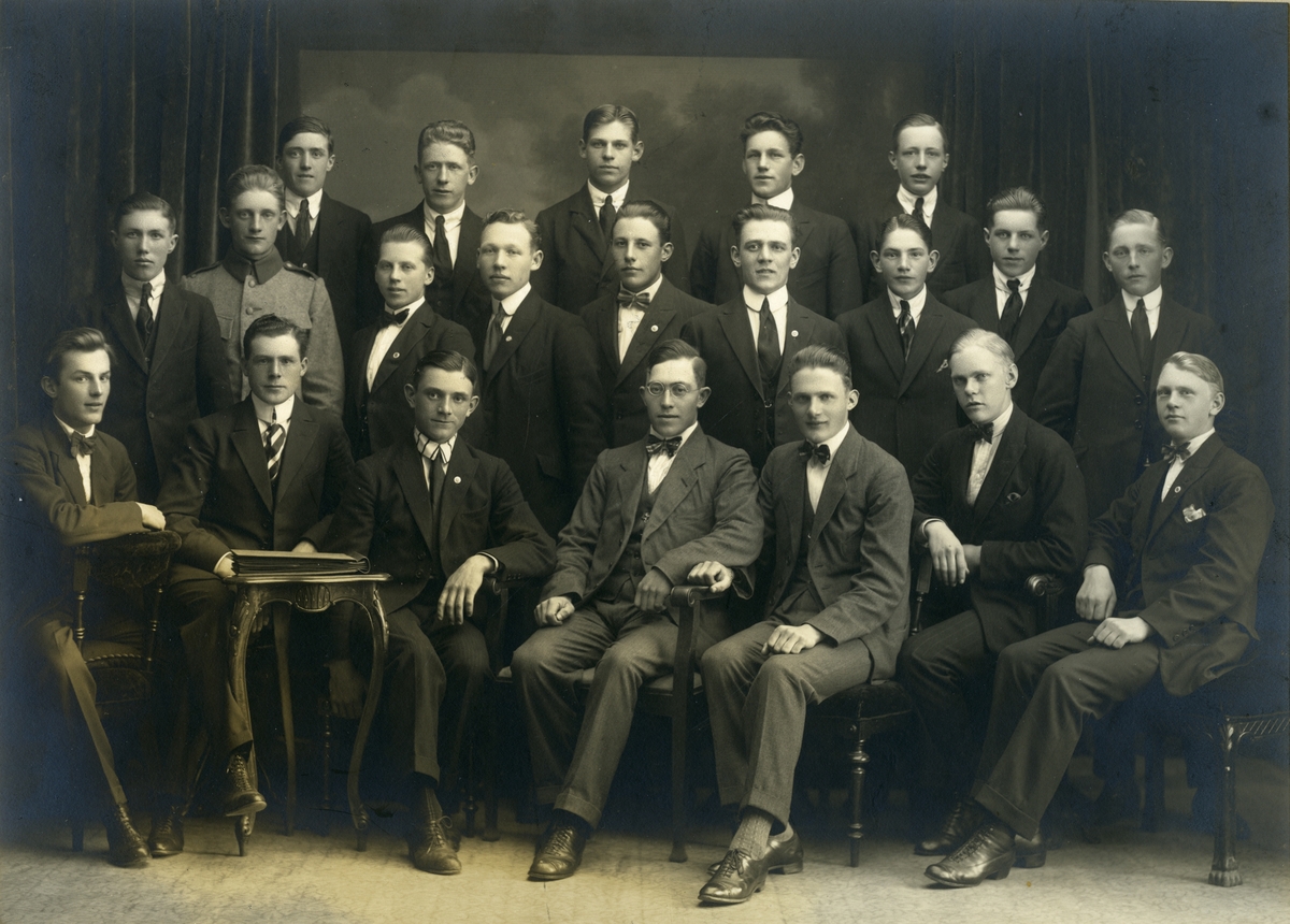 Medlemmar i fotbollsklubben Västra bollklubben från Gävle. I klubben spelade företrädesvis unga män från Gävle glasbruk och bryggeriet vid Gustavsbro. Harry Hansson sitter längst fram (i glasögon) och bakom honom står Henning Johannesson.