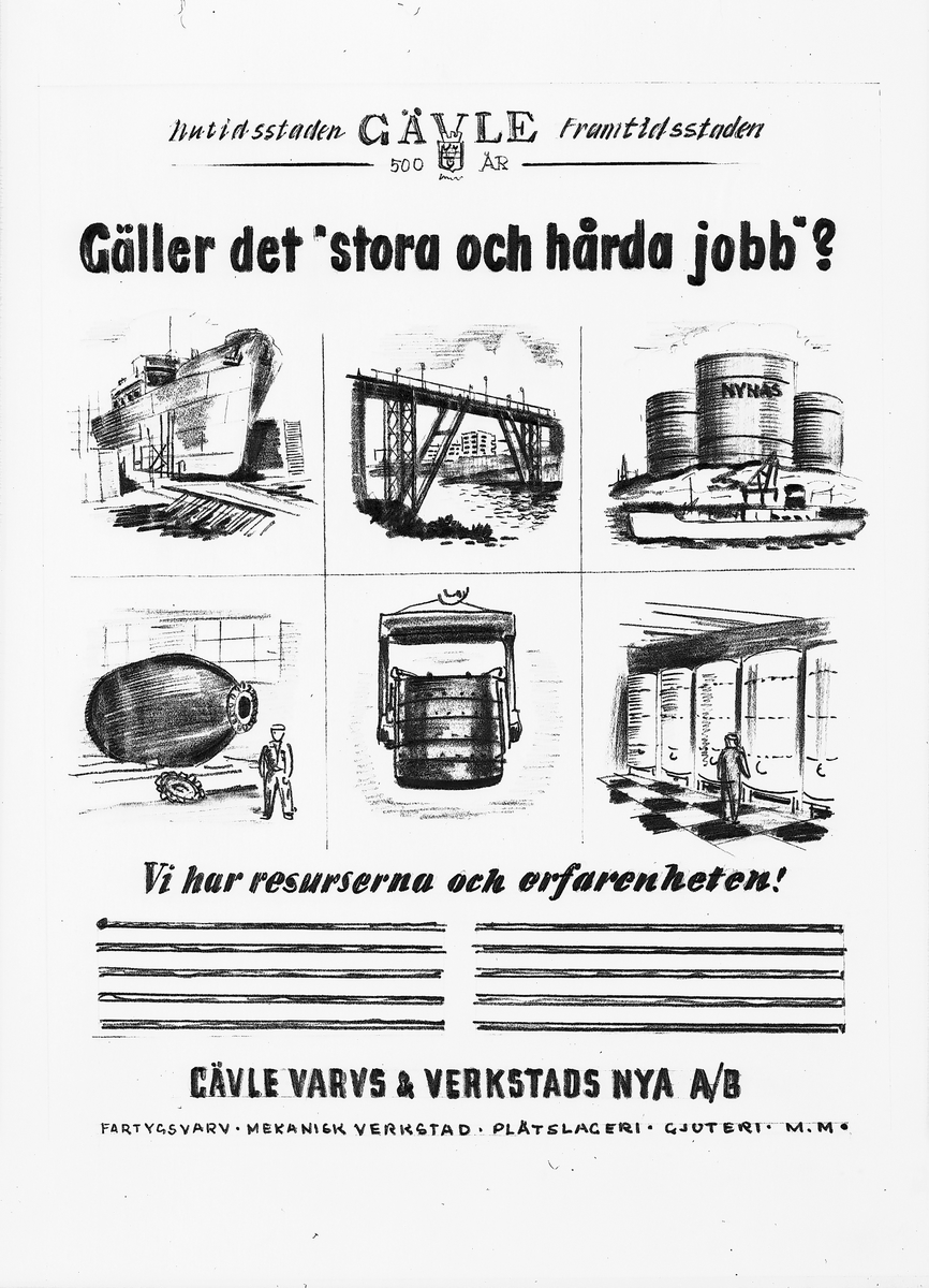 Förslag till Gävles 500-års firande år 1946. Gävle Varv anlades 1873. Efter en konkurs 1921 bildades Gefle Varfvs och Verkstads Nya AB, som bland annat tillverkade oljecisterner och utrustningar till pappersmassefabriker. På 1940-talet återupptogs skeppsbyggeriet.