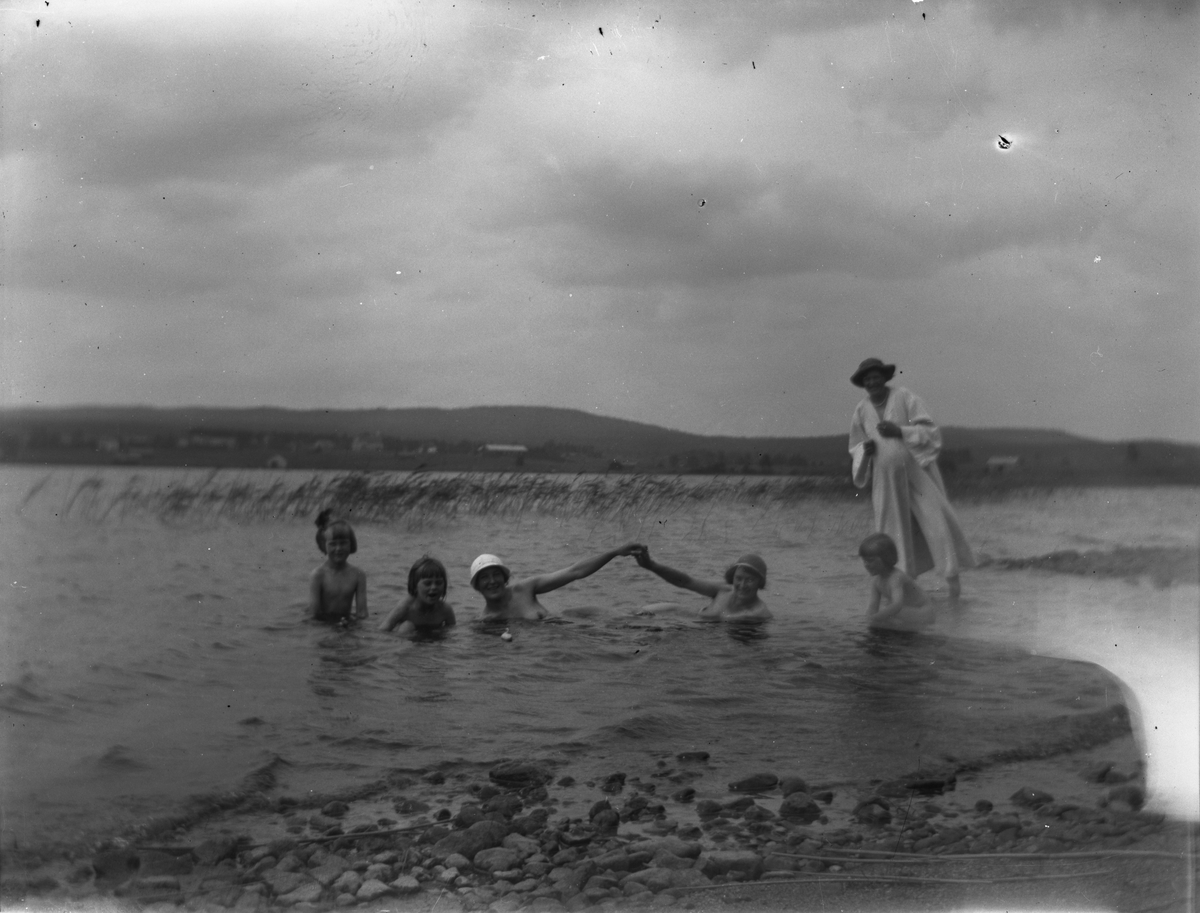 Efter Marma hyrde familjen Brundin en disponentbostad i Lingbo under sommaren. Här badar familjen i Lingan. Personerna från vänster: Karin, Ingrid, Anna Larsson från Hemlinggrind, obekant, Eva och Elna Brundin därbakom.