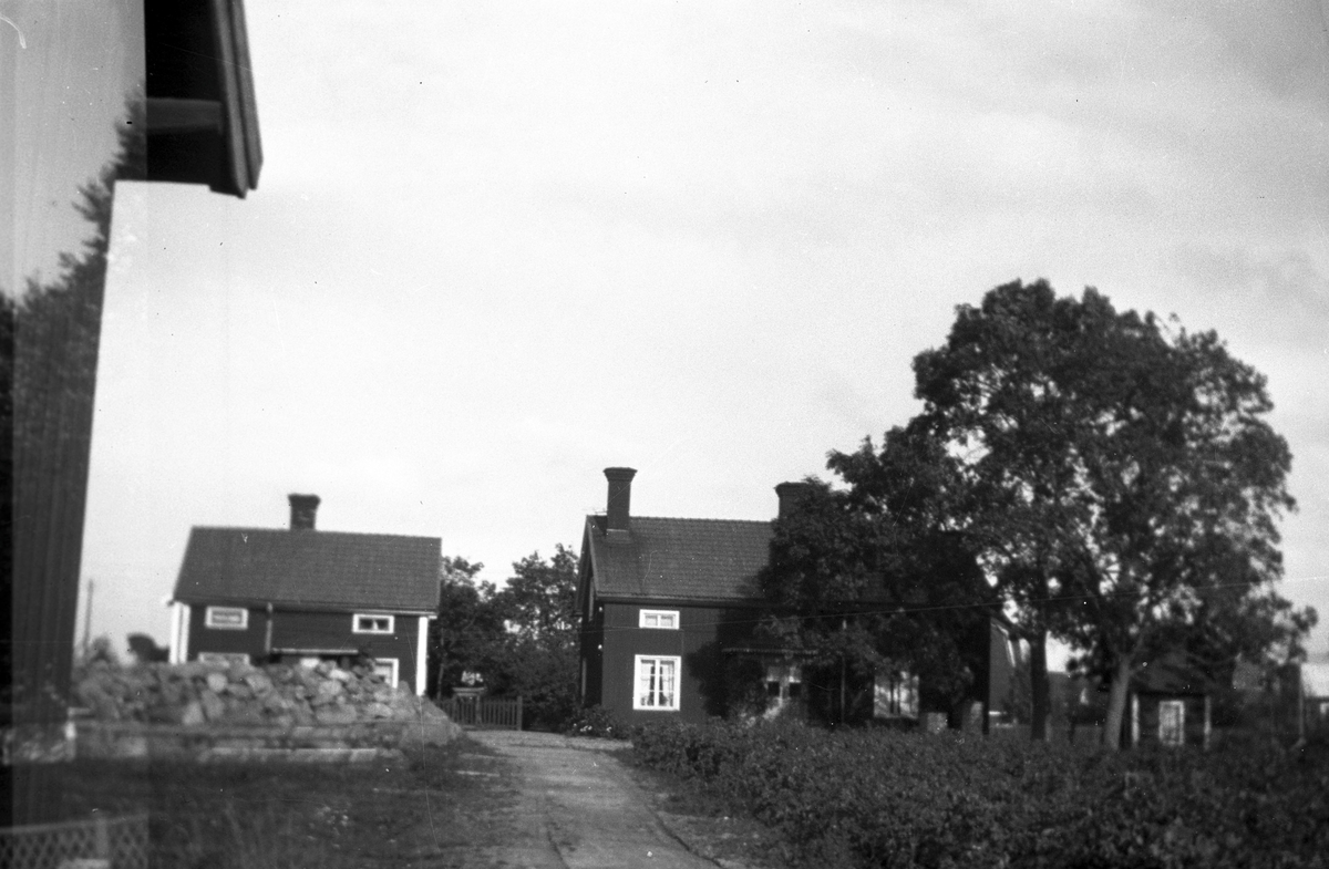 Foto från Hemlinggrind. Det stora huset ligger rakt fram och sommarhuset till vänster. Sommartid flyttade man över till det andra, mindre huset, som inte hade direktuppvärmning eller isolering. Det lilla huset till höger, som ser ut som en lekstuga, fungerade som mjölkbod.
