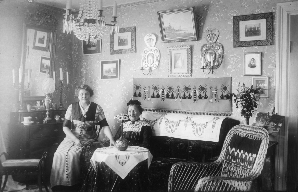 Interiörbild från Thorséns gård i Lenninge, Anna Thorsén och fru Norelius. Se även C 87-2809, 2810.
