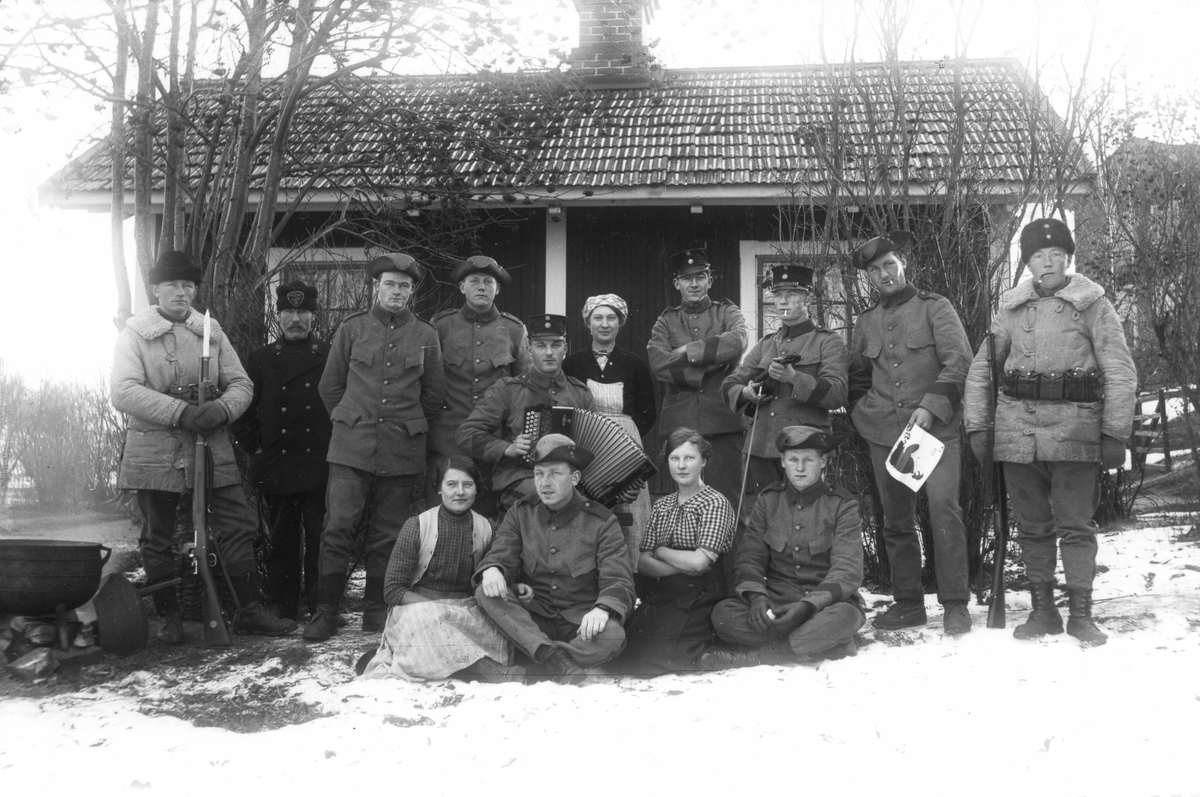 Banvakten Ek står som nr 2 från vänster. Flickan bakom dragspelaren är Elsa Ek, dotter till banvakten.