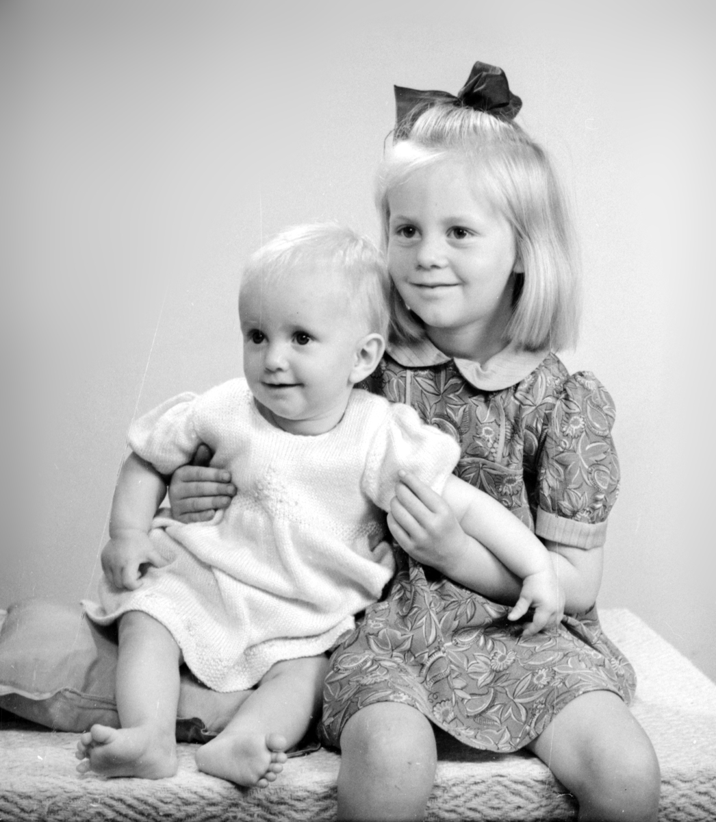 Lena Abrahamsson, f den 2 oktober 1946, och storasyster Siv Margareta Abrahamsson, f den 3 augusti 1942, Sikvik, Bomhus. Föräldrar: Sven Abrahamsson, f den 5 november 1909, och Rut Abrahamsson, f Wikström den 19 februari 1914. Foto i juni 1947.