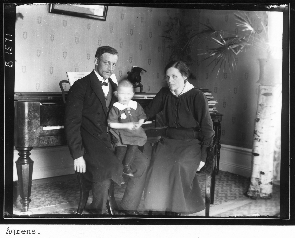 Skollärarfamiljen Ågren. Axel Ågren född 1885 och hustru Desideria (Dessy), född Skagerberg 1886, samt sonen Arne. Axel Ågren var organist och lärare i Åmot. Uppgiftslämnare Gerd Eskilsson, Solna den 21 juli 2009.