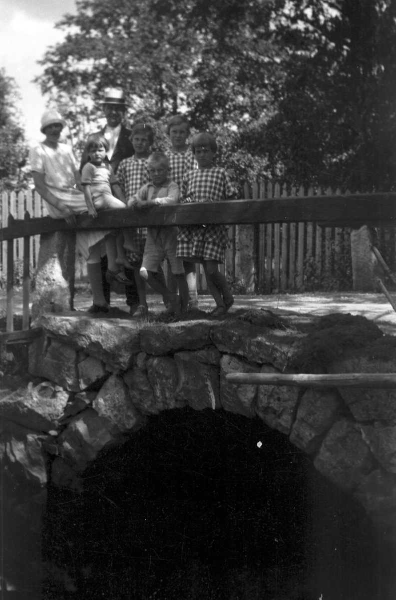 En bild utanför sommarstället i Lingbo. Familjen Brundin samlad tillsammans med Gunnar Malmberg.