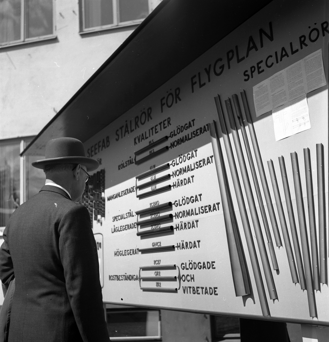 Titel: SEEFAB Sandviken 1895-1945 firar 50-års jubileum med middag. Juni 1945. SEE Fabriks Aktiebolag tillverkar olika slags stålrör. SEEFAB upptog bågtillverkning och fortsatte med stålrörspilar. Jämsides med dessa sportartiklar framställer fabriken hoppstavar, hoppribbor, spjut, flugspön, golfklubbor och hästpoloklubbor alla av välkänd kvalitet och väl lämpade för export. År 1945 har SEEFAB cirka 700 anställda.