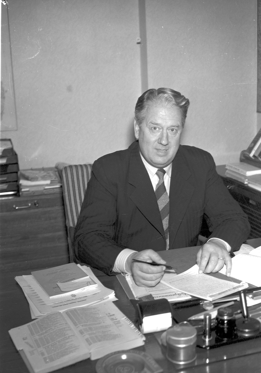 Länsarbetsnämndens direktör Colliander vid skrivbord. 7 oktober 1953.