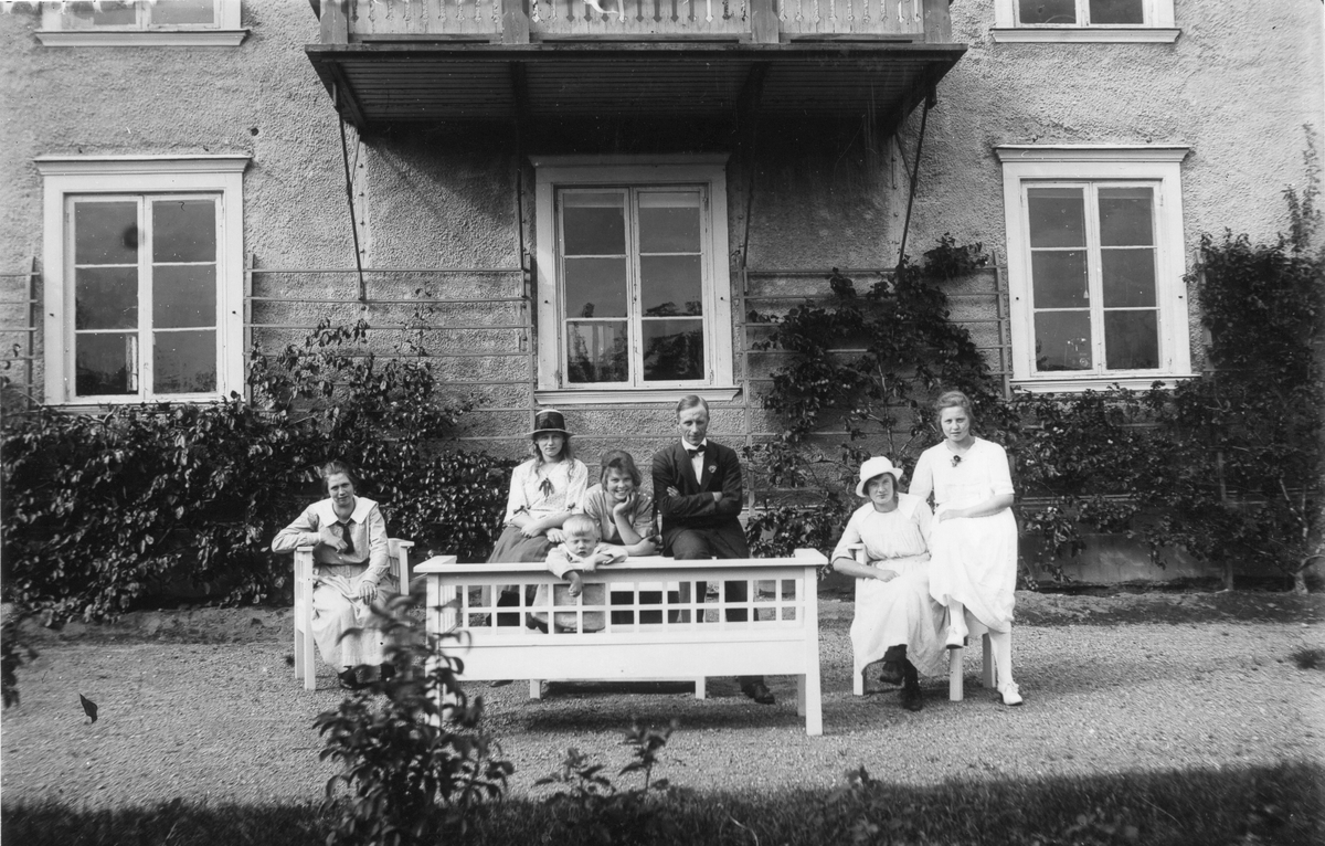 Vid södra gaveln på Lenninge herrgård. Från vänster: Edla Olsson (fadern var ladugårdsskötare på herrgården), Trädgårds-Emmy (Eriksson) och Trädgårds-Lisa, Smehammar-Herman (Larsson), Målar-Ebba (Wikström), Trädgårds-Tilda. Pojken är Trädgårds-Sven.