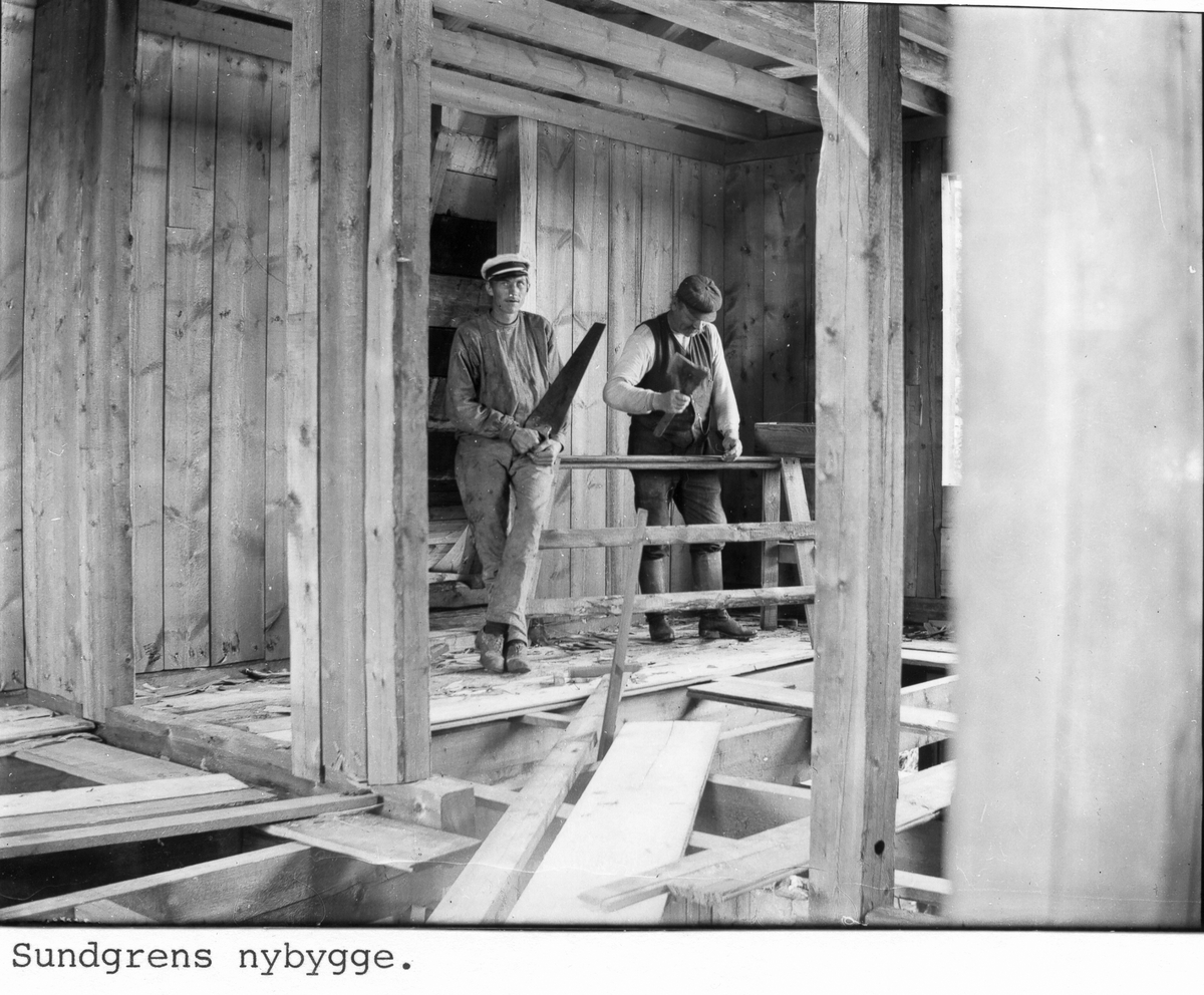 Sundgrens nybygge. Till vänster Sven Karlsson och till höger Johan Andersson (Topplund).