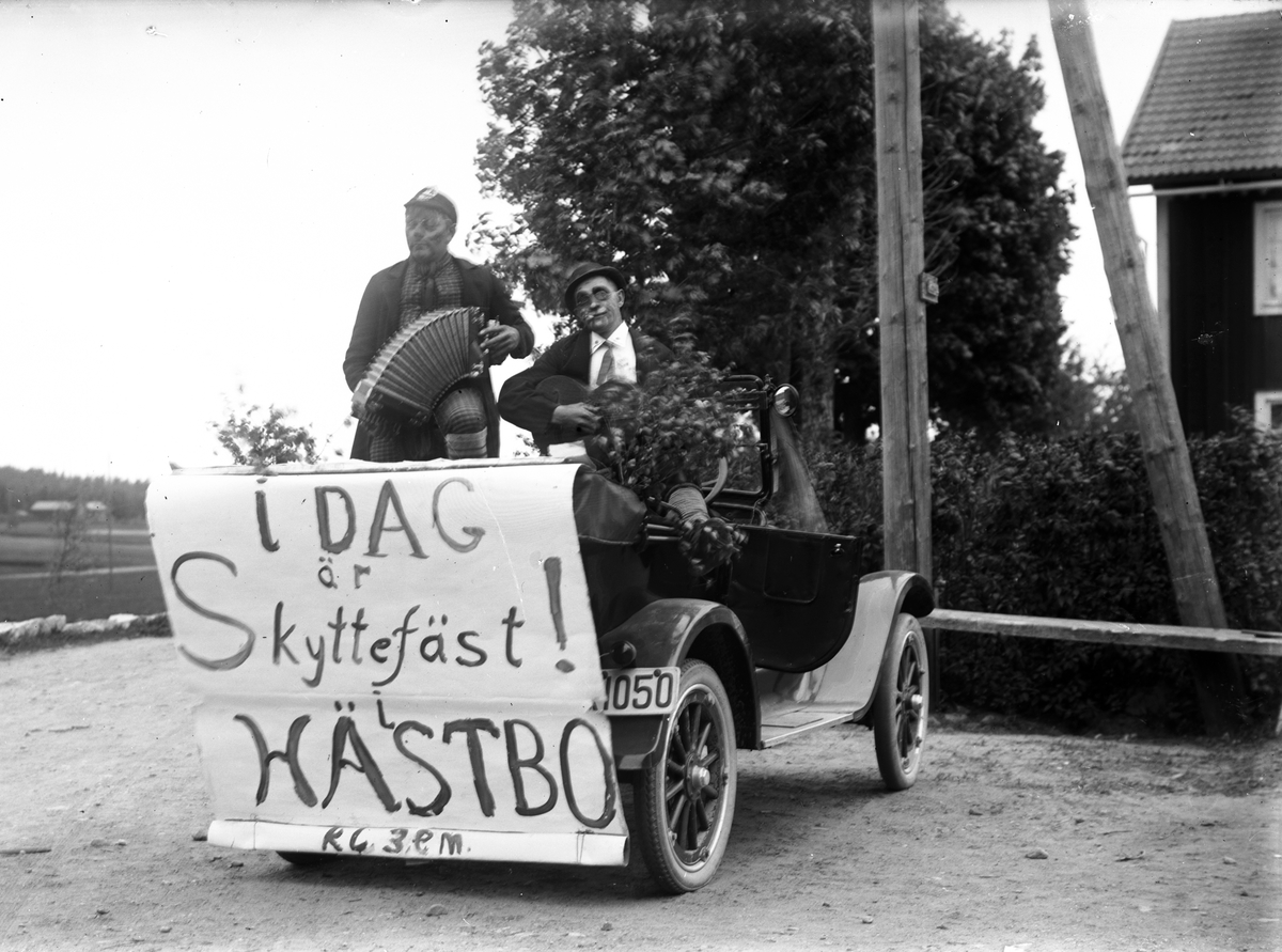 Reklam för "Idag Skyttefäst i Hästbo, kl. 3 em". Josef Eriksson, Hästbo, med dragspelet i sin Overland bil av 1922 års modell.