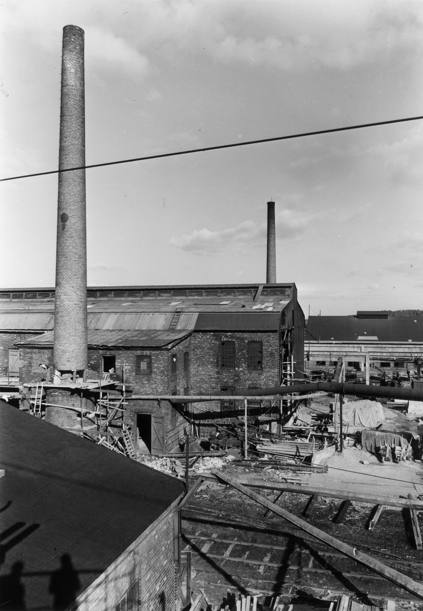 Martinugnsskorstenen, färdig för fällning. Skorstenen byggdes år 1900 (enligt ingenjör S Rudquist). Den fälldes den 20 september 1953 kl 14.15, för att ge plats åt en ny skorsten till den nya martinugnen.