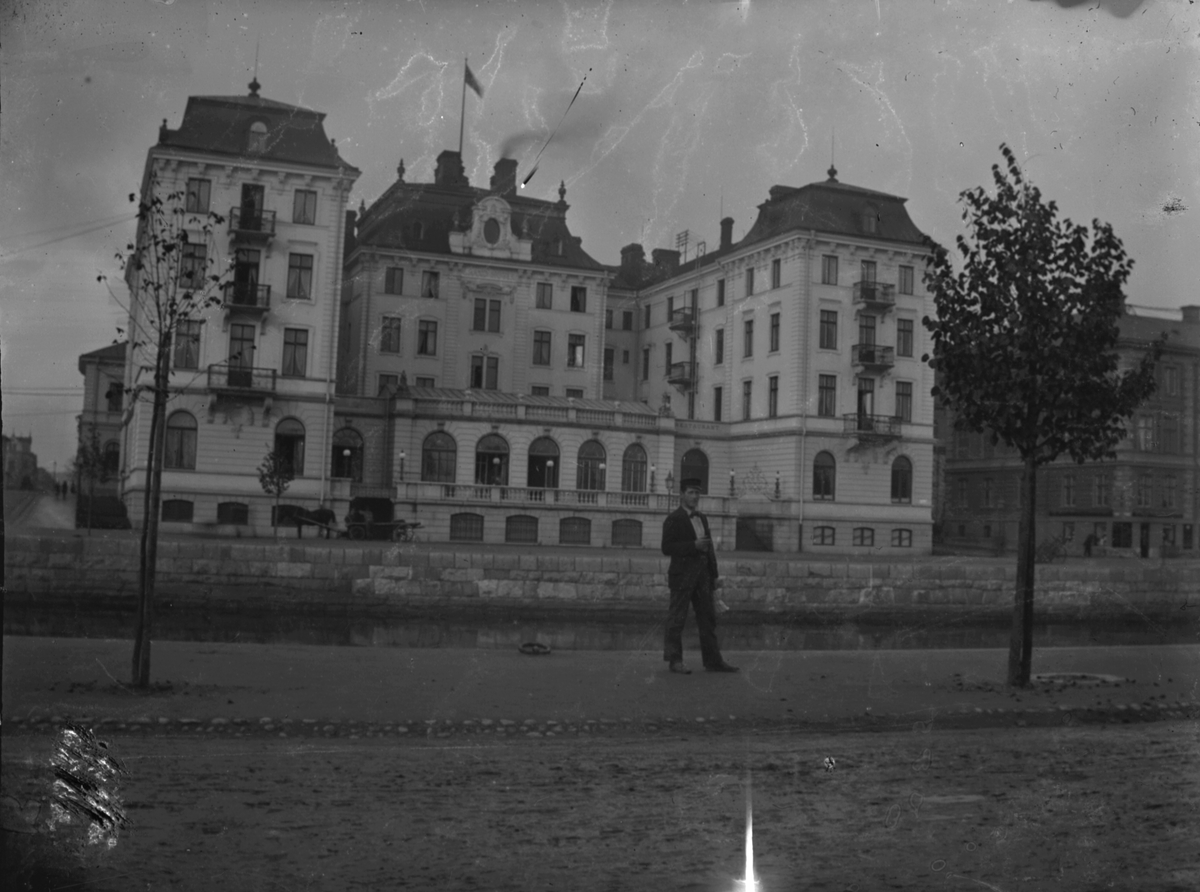 Man poserar vid ån, Grand Hotell i bakgrunden.
