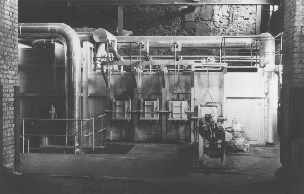 Baksidan av nya götverksugnen, kallad "utskjutare". Den nya ugnen, vilken fanns i hyttan, togs i bruk 1957 och användes t o m nedläggningen av götvalsverket 1981.