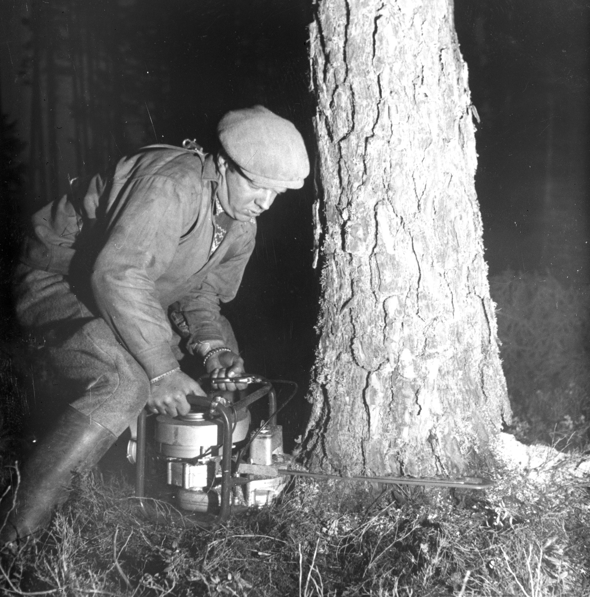 Skogsarbetare använder motorsåg vid trädfällning