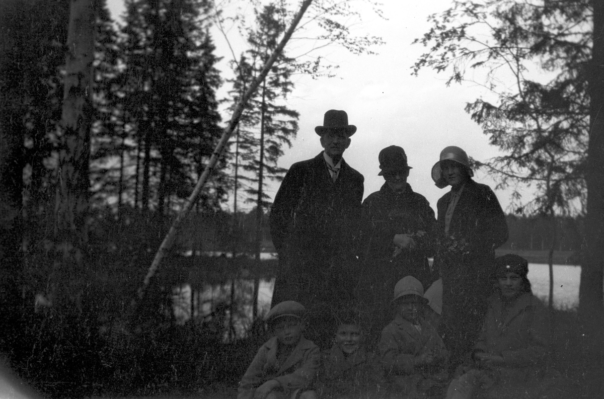 Till vänster Elna Brundins bror Einar Olsson, till höger om honom Elnas mor Anna Larsdotter Olsson och Karin Brundin. Framför Karin sittande från höger: Eva och Sören Brundin, Bengt Olsson och en okänd pojke.