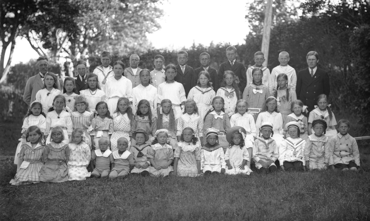 Söndagsskola i Wästra Hästbo. Lärare till vänster Strid och Albin Lindström till höger. Pojken i mörk kostym bredvid Strid är Ville Lindström. De flickor som står är fjärde flickan från höger Anna Lindström. Nedre raden sittande i gräset är från vänster fjärde och femte Joel och Ivar Vidgren