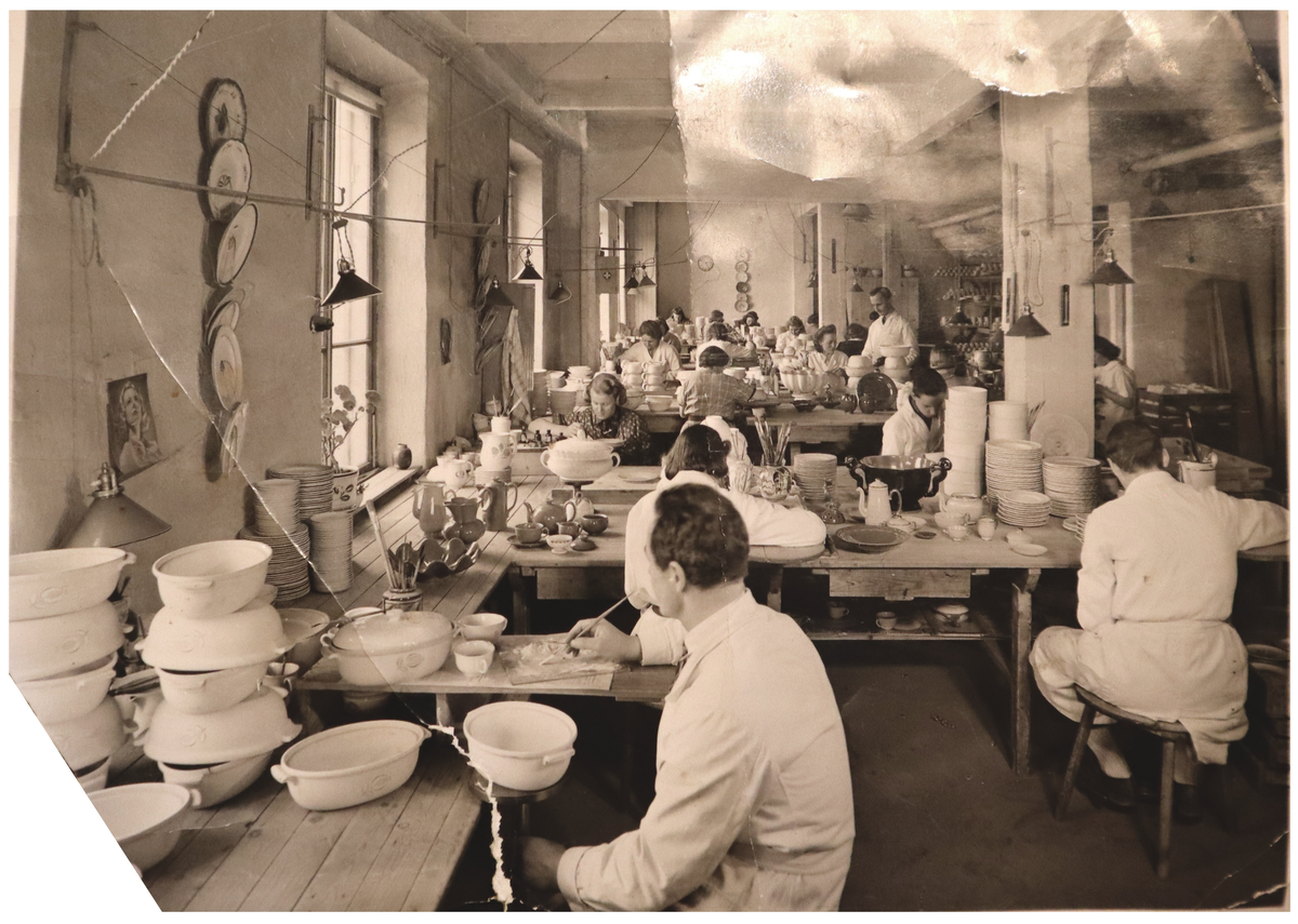 Målarsalen vid Gefle Porslinsfabrik där handmålade dekorer utfördes. Stående syns chefdekoratör Eugen Trost.