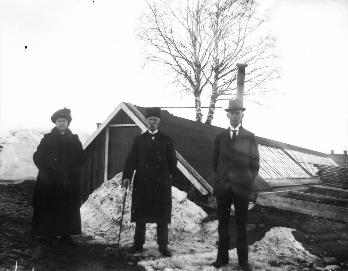 En kvinna, två män framför växthus.