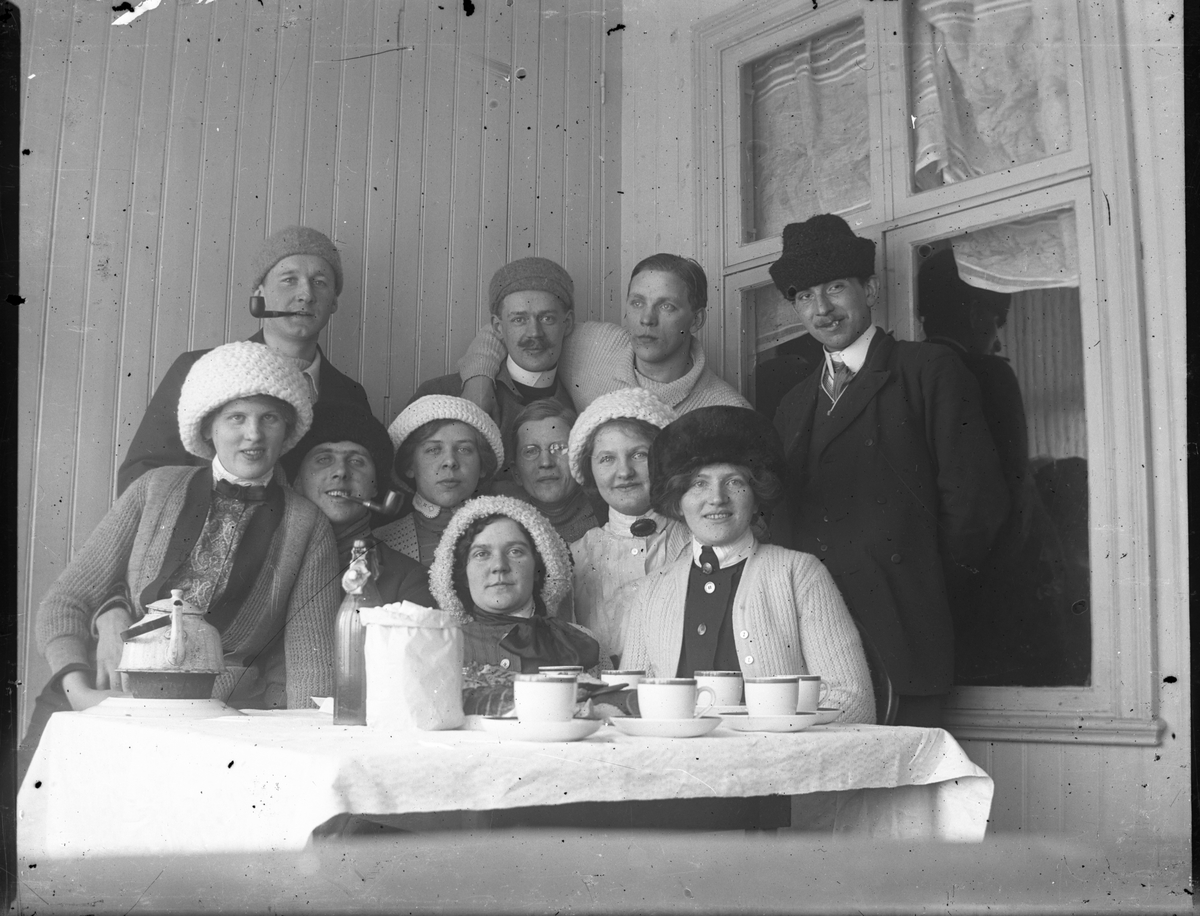 Ett gäng med bl a Elnas systrar med uppvaktning. Einar Olsson, en bror, skymtar fram i mitten med pincenéer. Längst till vänster syster Naemi, sittande längst till höger syster Gertrud.