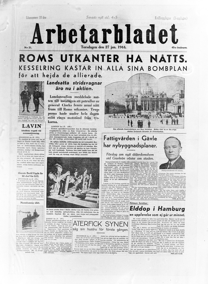 Första sidan av Arbetarbladet Torsdagen den 27 januari 1944. Bland annat med "Roms utkanter ha nåtts. Kesselring kastar in alla sina bolmbplan" och "Fattigvården i Gävle har nybyggnadsplaner".