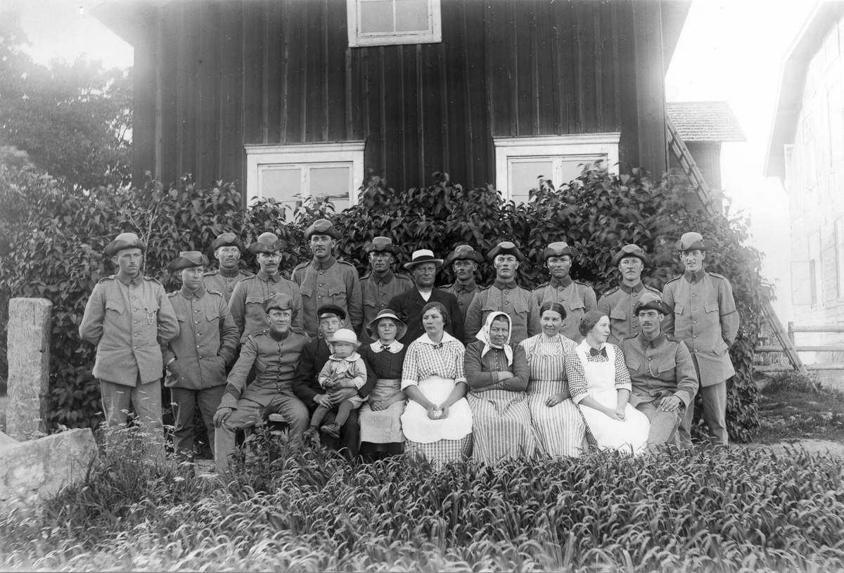 Från vänster: plantare från Ljusne, Hans Larsson från Lilltjära i Hanebo. Mannen i ljusa hatten är Skinnar-Pelle (Hansson), kvinnan med ljusa huvudduken är hans fru Marta, omedelbart till höger om henne sitter Ella Olsson som var syster till Skinnar-Pelle, stående näst längst till höger är Lars Olsson från Rengsjö och ytterst Lundeberg från Gävle. Sittande från vänster: Gunnard (befäl), Evert Svedlund med Skinnar-Jonas i knät. Jonas var född 1913. Militärerna som bevakade järnvägsbron bodde i Ol-Ers och åt i Skinnars. I bakgrunden Skinnars "gammelbyggning", som numera är riven. Till höger skymtar nuvarande boningshuset. Bilden troligen från 1916.
