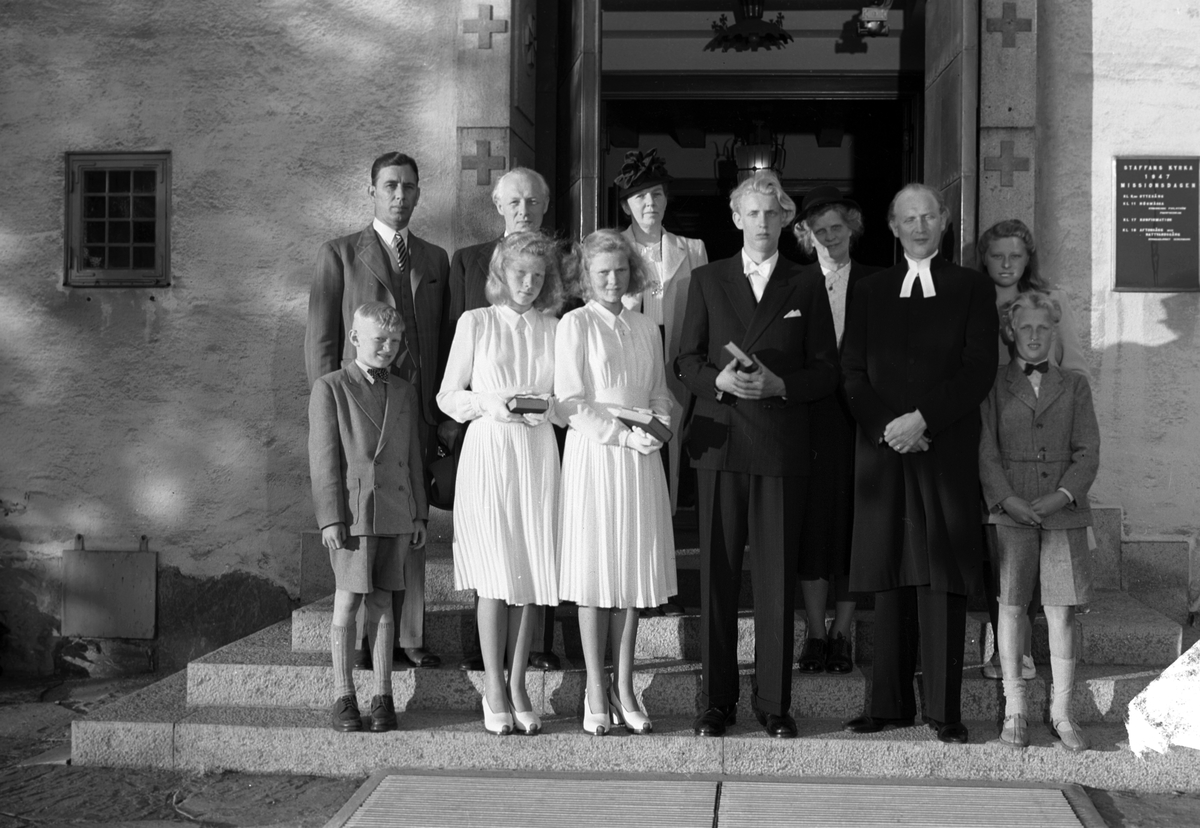 Kyrkoadjunkt Alvar Cedermark. Konfirmander med släkt. Juli 1947. Doktorinnan Karin Cedermark, Odengatan 22 4 tr, Stockholm.