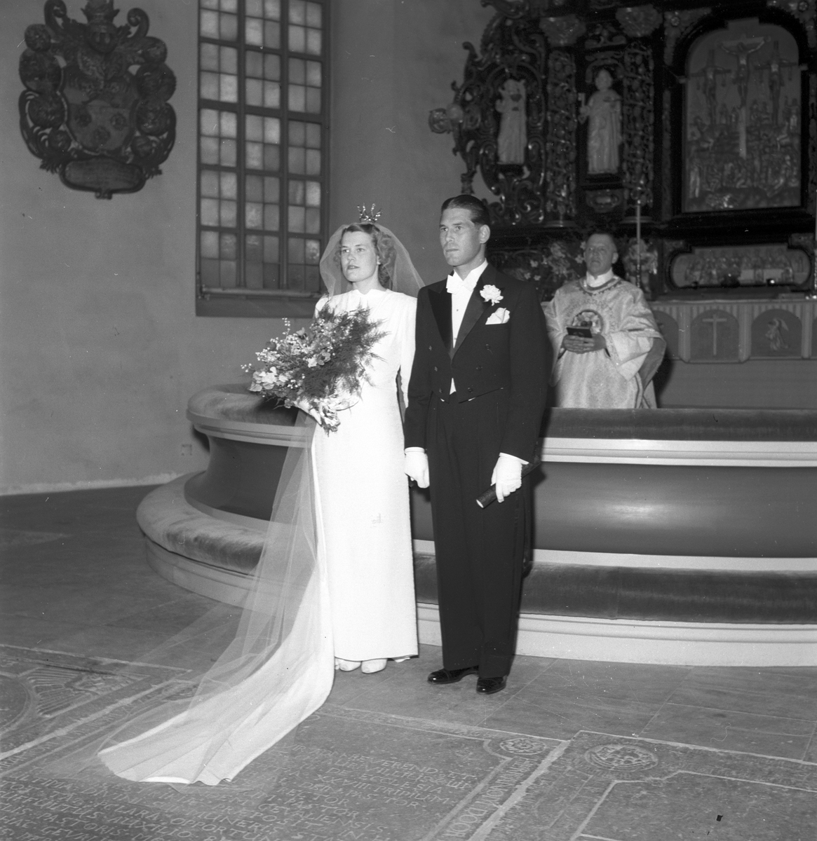 Titel: Ingenjör Eric Eriksson. Brudparet gifter sig i Heliga Trefaldighetskyrkan, Gävle. Juni 1945.