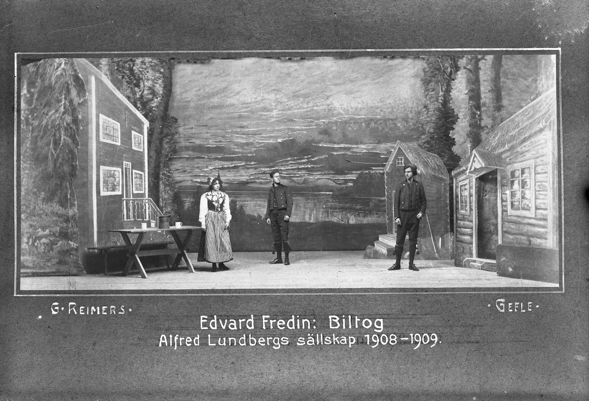 Edvard Fredin: Biltog. Alfred Lundbergs sällskap 1908-1909. Alfred Lundberg. Född 1852, död 1935. Under åren 1905 -11 drev han A. L.-sällskapet. Skådespelare,teaterdirektör. Edvard Fredin. Född 1857, död 1891 Stockholm. Dramatiker, skådespelare, teaterrecensent och översättare.