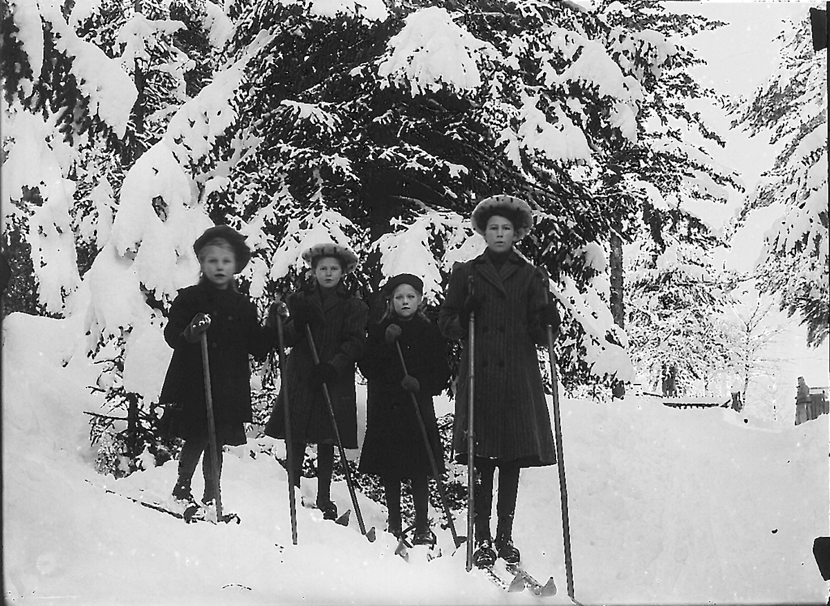 Från vänster: okänd flicka, Elvira Lindberg, okänd flicka, Ester Lindberg. Anna Lindberg står vid grinden i Östansjö.