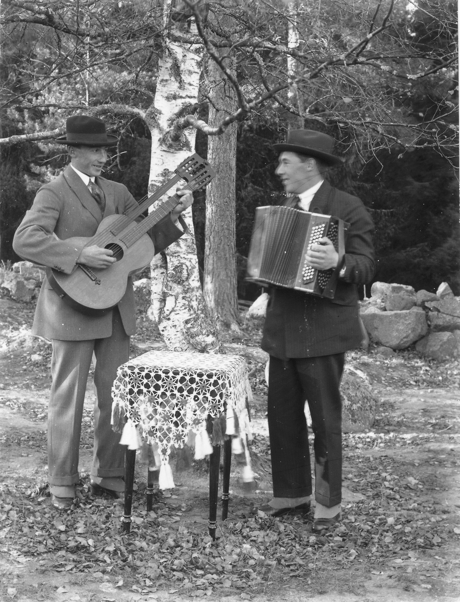 Mannen med dragspelet är Elof Forslund, Östansjö. Fotot är taget på "Berget" i Östansjö.