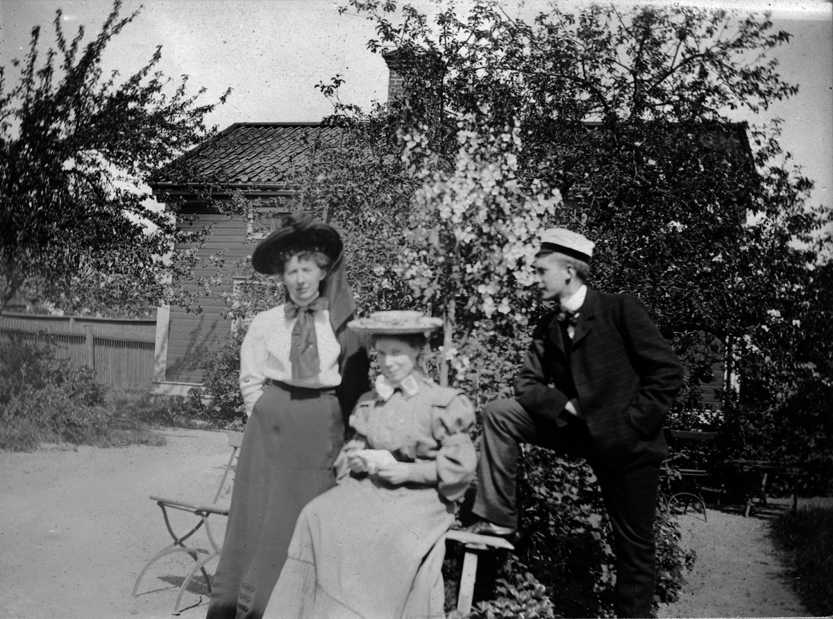 Titel: Lillstugan omkring 1905. Från höger: Birger Enlund, Gertrud Enlund, fröken Evy Olsson, sedan gift Hardin (?) i New York.