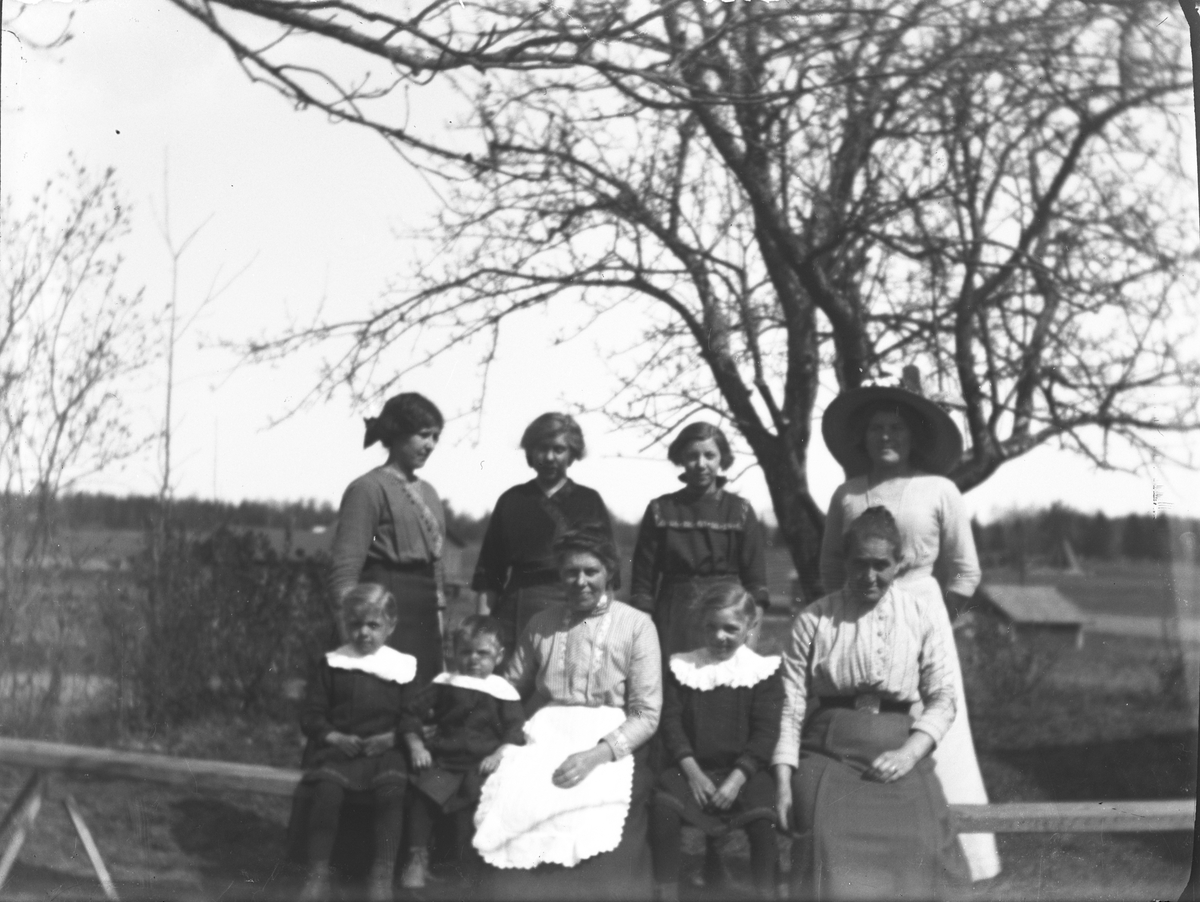 Åsmundshyttan nummer 6 "Matsas". Stående från vänster Anna Lindqvist f. 10 augusti 1895, Signe Lindqvist f. 21 juni 1894, Berta Lindqvist f. 29 augusti 1898, okänd kvinna. Sittandes från vänster Astrid Lindqvist f. 2 november 1907, Gustav Lindqvist f. 31 januari 1911, husmor Brita Stina (Briten) Nilsson-Lindqvist f. 19 juli 1869, d. 18 juli 1939, Elsa Lindqvist f. 17 juni 1905 och svärmor Brita Stina Ersdotter f. 7 januari 1849, d. 23 juli 1924 (född på gården).