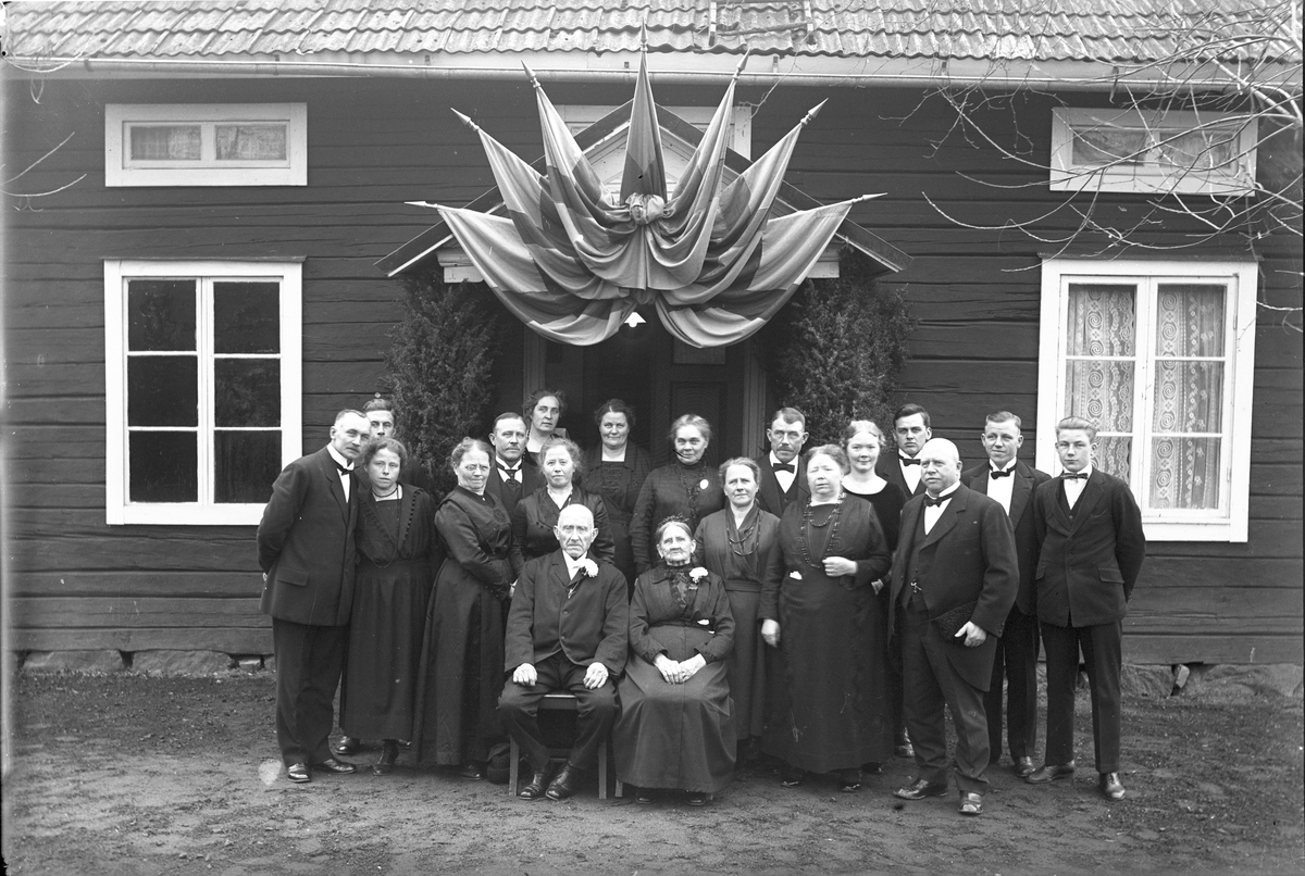 Sittande längst fram Anders Jansson och Carin Andersdotter, stående bakom fr. v. August och Hulda Ekman, Margareta Eriksson, Hanna Mårthas, Mina Norman, Anna Andersson, Carl Wirén. Andra raden stående okänd, Clas Andersson, okänd, Anders Andersson, okända. Längst bak fr. v. Beda Adersson och okänd.