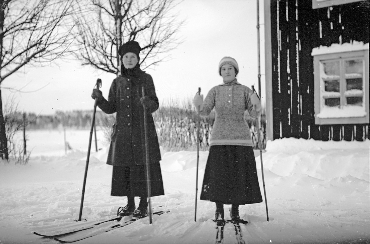Två kvinnor på skidor vid "Erik Lars", Josefs hem i Hästbo.