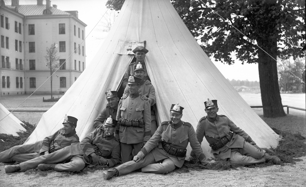 Militärer tältar utanför kasernen vid Hälsinge Regemente I 14.
