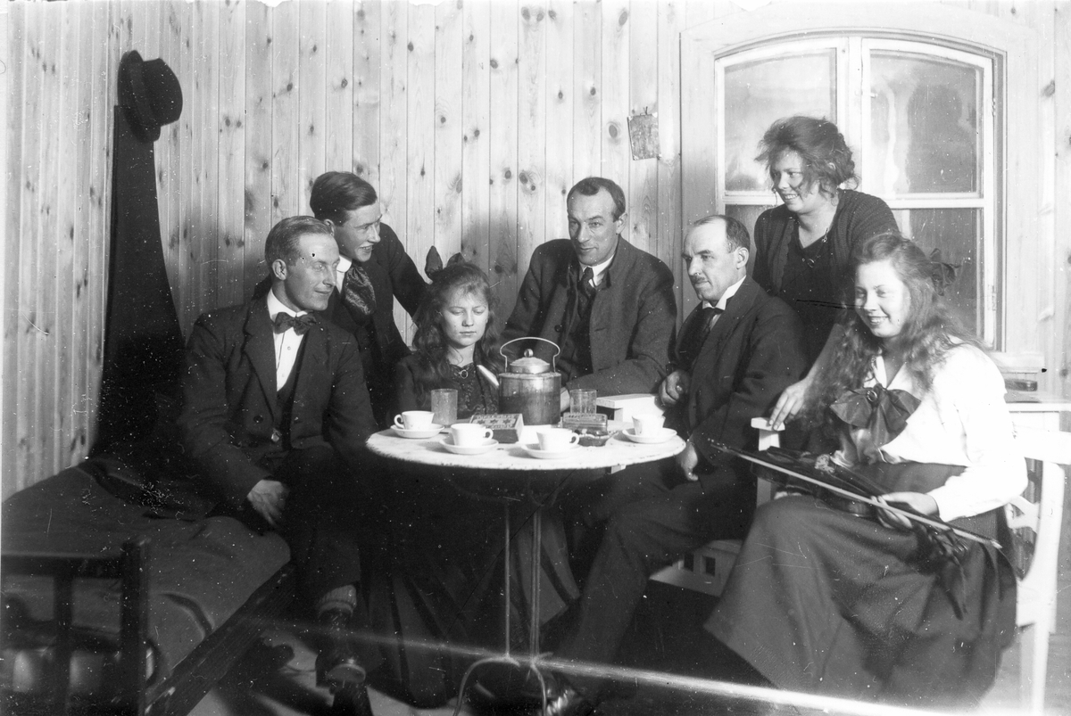 Personerna från vänster: Smehammar-Herman (Larsson), Storpelles-Johan (Eriksson), Trädgårds-Emmy (Eriksson), Målar-Erhard Nilsson, Målar-Emil Nilsson, Trädgårds-Lisa och Trädgårds-Tilda.