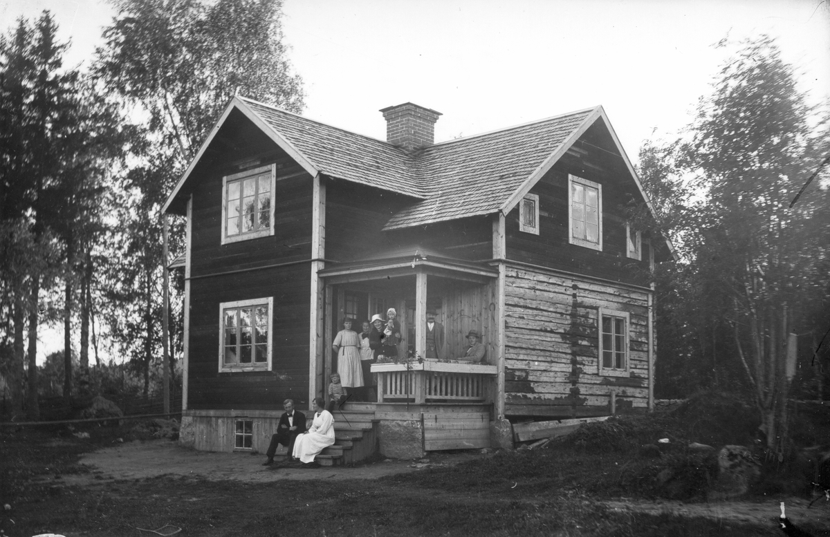 Per Larssons nybygge på Lenninge 6:32. Den synliga timmerstommen är en del av det från Smehammar flyttade huset. Personerna: längst ner Herman Larsson och en okänd kvinna. Pojken på trappan är Sixten Larsson. Stående från vänster: Anna Larsson, Hilda Styf, Linnéa Larsson och Per Larsson. Sittande troligen Herbert Olsson från Mjölnars. Foto 1918-1919.