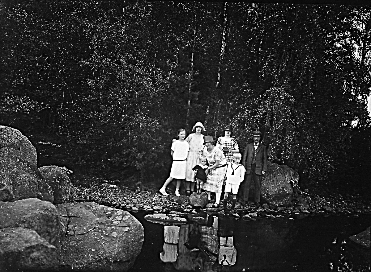 Karin Edlund, Valborg Lindberg, Göte Edlund, Marta Edlund, Signe Johansson, Erik Edlund, Per Larsson. Foto vid Holmabron 1925.