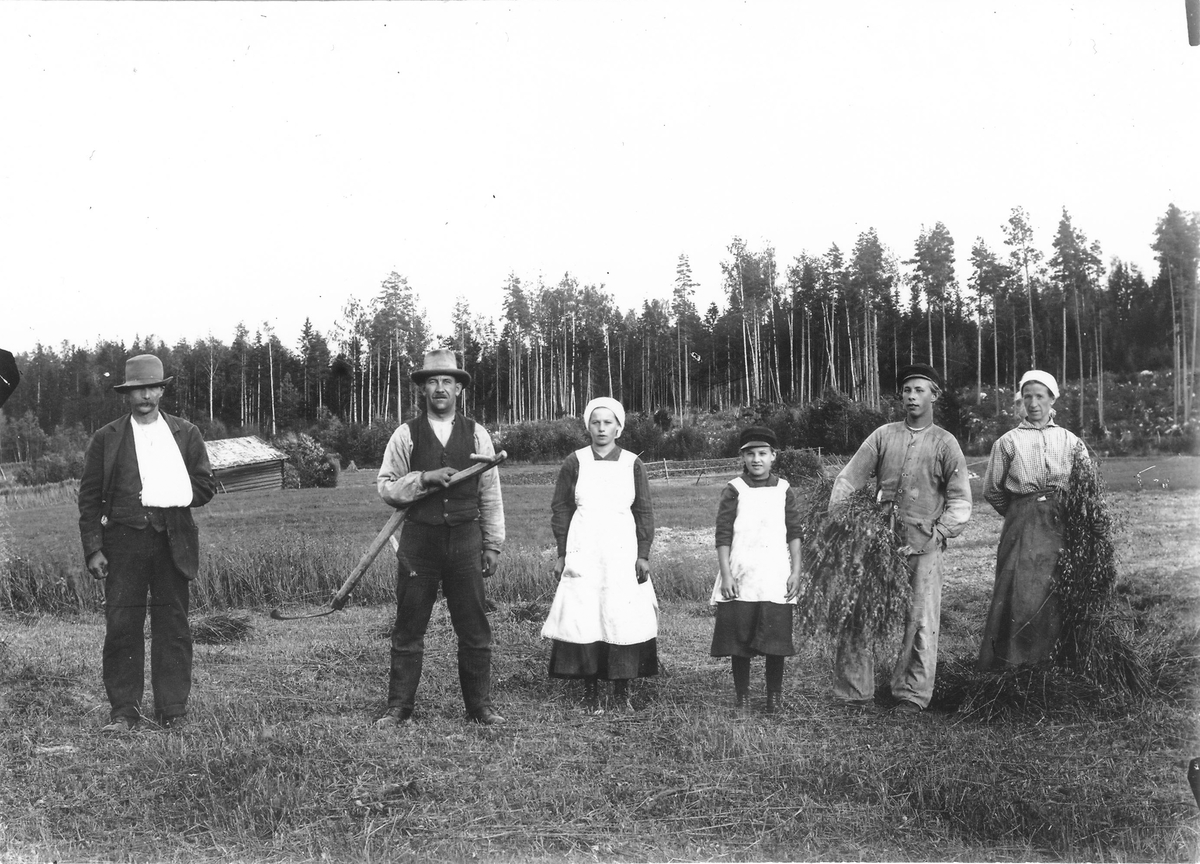 Mannen med lieorvet är troligen Persson, bonde på "Nylannenes" i Herte, som kom flyttandes med sin familj från Ovanåker omkring 1918. Flickan med vitt förkläde till höger om Persson är hans dotter Stina, gift med Lars Eriksson, "Ersk-Jons", senare bosatt i "Pumpmakars" (nedanför "Brittgården" i Herte).