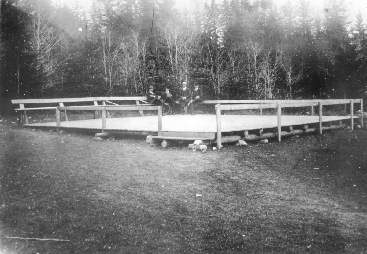 Dansbana i Västansjö ("Nygårdsbackarna"). Dansbanan låg mittemot skolan. Männen från väster Anders Eriksson, okänd, Per Gren, okänd.