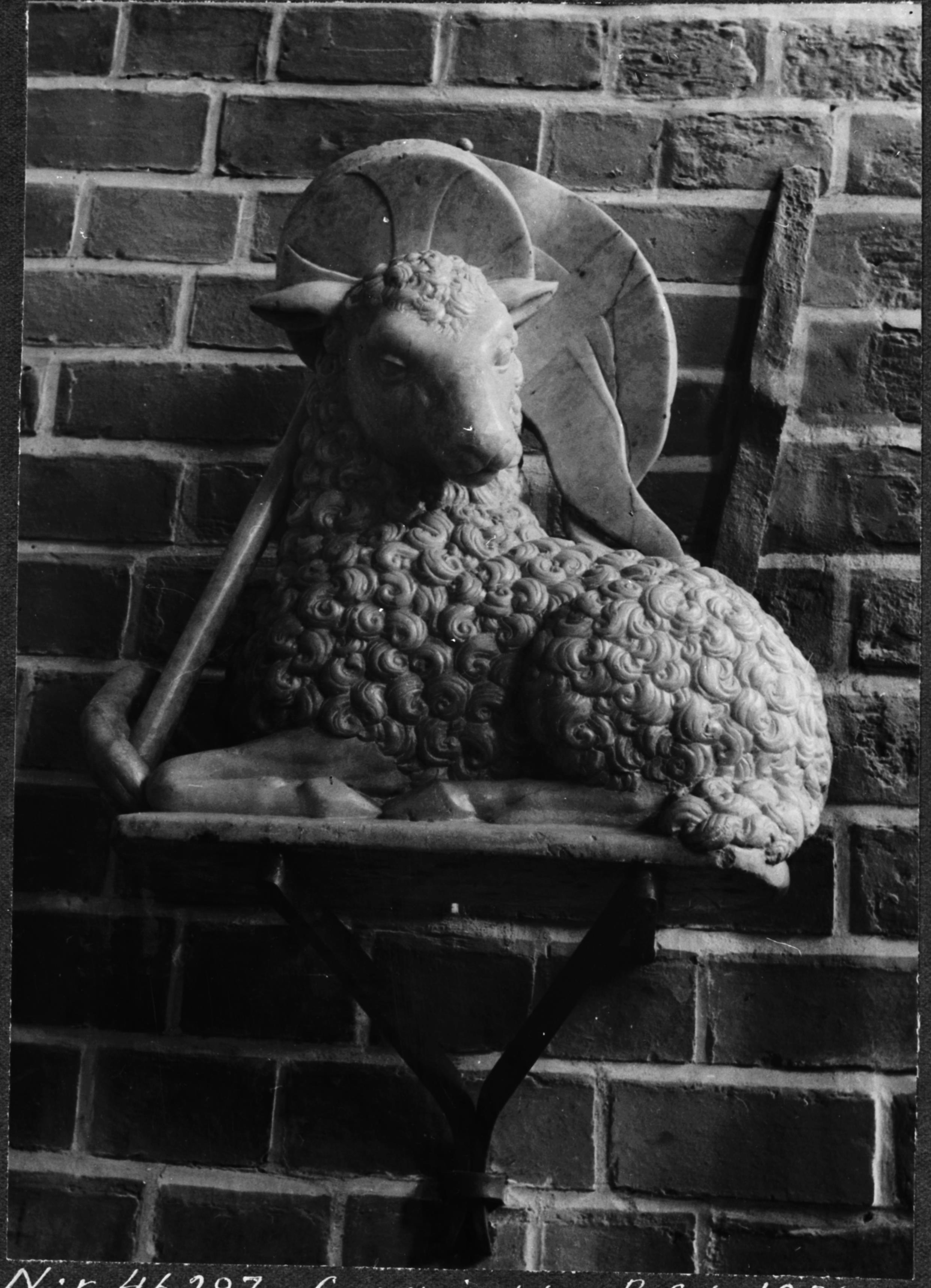 Skulptur, sten, lamm med korsfana, troligen 1600-tal.